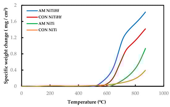 As is shown in Figure 2 and Figure 3, it can be observed that the mass gain of the AM NiTiHf at 500, 800, and 900 °C is higher than that of AM NiTi alloys, which suggests that the addition of Hf decreases the oxidation resistance of the alloy.
