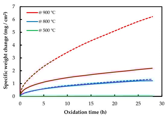 Thermogravimetric curves of isothermal oxidation of AM (dash line) and CON (solid line) NiTi alloy at 500, 800, and 900 °C.