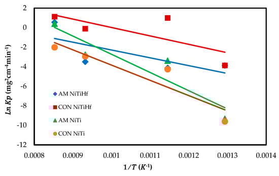 Figure 4 displays the Arrhenius plot of the oxidation rate constant for all alloys. The activation energy () is found to be 60.634 kJ/mol for AM NiTiHf, 91.454 kJ/mol for CON NiTiHf, 175.25 kJ/mol for AM NiTi, and 146.16 kJ/mol for CON NiTi. It can be derived that the addition of Hf decreased the activation energy. The amounts of activation energy confirm the dynamic oxidation result so that the earlier oxidation happened in the alloys with the lower activation energy.
