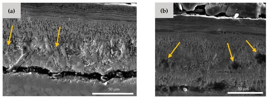 As shown in Figure 6, there are also some microcracks and micropores formed in the Hf-rich oxide layer. The microcrack formation is a result of the brittleness of the HfO2 phase [27]. The small pores, which are highlighted by arrows in Figure 6b, can be explained by the Kirkendall effect [36,37]. The different diffusion speed of Hf, Ni, and O element results in the formation of the vacant areas and porosities inside the material. It is worth noting that these microcracks and pores facilitate the entrance of oxygen, which can cause more mass gain in the NiTiHf samples in comparison to the NiTi samples.