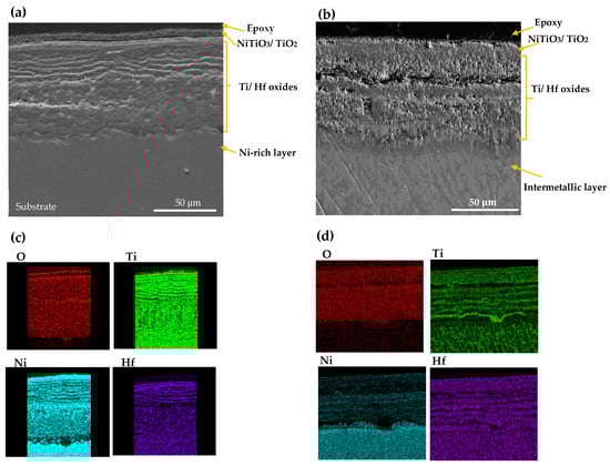SEM image and X-ray mapping of the cross section of oxidation scale. (a,c) AM NiTiHf at 800 °C; (b,d) AM NiTiHf at 900 °C.