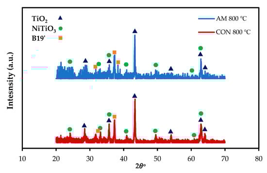 To confirm the EDS result, parallel-beam geometry XRD with a low angle of the incidence was performed for AM and CON NiTiHf alloys at 800 °C (Figure 8). For both alloys, the TiO2 rutile and NiTiO3 are the main phases of the scale surfaces. The XRD analysis confirms the microstructural characterizations.