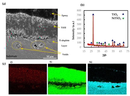 As discussed in Section 3.1, the oxidation kinetics of AM and CON NiTi follow the single-stage parabolic law. To show the microstructure of the oxide scale for the AM NiTi part at 900 °C, SEM, X-ray mapping, and XRD of the oxide cross section are presented in Figure 9. The SEM shows a dense oxide layer adhered properly to the parts. The X-ray mapping suggests a Ti oxide layer at the outer surface with a thickness of 75 on average. The SEM results are also confirmed by the low-angle parallel beam XRD pattern showing the TiO2 rutile phase at the outermost layer with a very small portion of NiTiO3 phase. Similar to the NiTiHf cases, the reason for TiO2 oxide formation can be explained based on Gibbs free energy [39]. The X-ray mapping shows the outward diffusion of Ti to react with oxygen atoms migrate inward through the part. However, the Ti diffusion is faster than the oxygen toward the TiO2 rutile layer [40]. Thus, the rutile grows outward, while Ni diffuses inward and forms a Ni-rich layer beneath the rutile oxide. The exothermic nature of oxide formation leads to increasing the thickness of the oxide layer by increasing the temperature or time, and therefore, as time passes, the oxide layer adds up. The parabolic kinetic law of NiTi oxidation behavior can be explained by the barrier effect of rutile on Ti outward migration. Ti diffusion through the rutile layer is inversely proportional to the rutile thickness so that by increasing the oxide thickness, the speed of Ti diffusion drops. The void formation inside the rutile layer closing the Ni-rich interface might be the result of the rutile crystals growing in different directions. The dominant direction of the rutile growth at the initial stage is outward, but as the oxide layer increases, the rutile crystals tend to grow in the lateral direction. As a result, the different growth rate and direction between the rutile crystals creates micro voids, mostly near the Ni-rich interface. There are also some voids in the Ti-deplete region, which are encircled (Figure 9a). As discussed before regarding the difference between the diffusion rate of rutile and oxygen atoms, the Kirkendall effect happens in matter with a higher diffusion rate [41,42]. The other defect happening during the oxidation process is a long crack forming along the TiO2 and Ti-deplete interface. We believe that this crack happened during the cooling stage and not during the oxidation process. The brittleness of the TiO2 oxide layer and different thermal expansion of the two layers causes crack formation in the cooling stage. The oxidation kinetics of parabolic law with no deviation during the process confirms no cracking happened during the heating.
