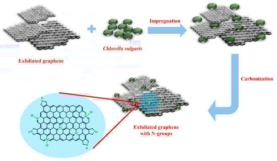 Preparation procedure of N-doped exfoliated graphene synthesis involving electroexfoliation of graphite and Chlorella vulgaris as the nitrogen source.