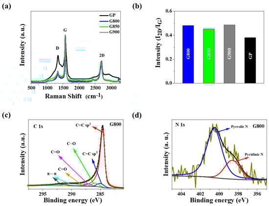 (a) Raman spectra and (b) intensity ratio of pristine graphite powder (GP) and N-doped exfoliated graphene obtained in GX series; (c) X-ray photoelectron spectroscopy (XPS) spectra of C1s and (d) N1s for G800 sample.