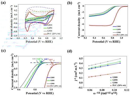 Cyclic voltamperometry was the next step in the physicochemical characterization of the produced catalysts (CV), along with linear sweep voltamperometry to check catalytic activity in ORR. Catalytic ORR activity is fundamental for metal-air batteries, including Zn-air ones. In recent years, heteroatom-doped graphene has been one of the mainstream electrocatalysts, including ORR. Since carbonization temperature influences electric properties, such as the conductivity of a heat-treated material like Chlorella vulgaris, three catalysts were subjected to carbonization at 800 °C, 850 °C, and 900 °C. Such temperatures are usually high enough to convert many non-conductive organic materials into conductive carbon-based matrixes [,,]. For comparison, another carbon-based material, a Pt/C (20 wt.% Pt) catalyst, was also tested under the same conditions. The tests were carried out in 0.1 M KOH electrolyte in an oxygen atmosphere. CV plots depicted in Figure 4a show characteristic cathodic peaks for G800, G850, and G900 placed at −0.23, −0.25, and −0.28 V vs. Ag/AgCl in the alkaline electrolyte saturated with oxygen, respectively. For the commercial Pt/C catalyst the cathodic peak was recorded at −0.28 V. Featureless voltammetric currents in the potential range of −1 V to 0 V were observed in a nitrogen atmosphere. This ascribes the origin to ORR and indicates good electrocatalytic properties in the GX sample series. Onset potential and the number of transferred electrons is very important in the evaluation of catalytic activity in ORR. Before calculating the value of this parameter, a linear sweep voltamperometry (LSV) was carried out. Figure 4b contains the LSV plots obtained at a rotation rate of 1600 rpm and a scanning rate of 5 mV s−1 in 0.1 M KOH in O2 saturated for N-doped graphene-based catalysts and the reference commercial Pt/C (20 wt.% Pt) catalyst. The G800 sample was characterized by the largest current density compared to the G850 and G900 samples, and the Pt/C catalyst. This result reveals that for these materials the preferred temperature for electrocatalytic activity in ORR is 800 °C. The values of the onset potential are presented in Figure 4c. For the samples G800, G850, and G900, they are 0.88 V, 0.87 V, and 0.84 V, respectively. The G800 sample exhibits the best catalytic properties, with the cathode peak at −0.2 V vs. Ag/AgCl, while the onset potential was 0.88 V. This is a relatively similar, though slightly smaller, value to commercial Pt/C catalyst. The obtained materials are based on graphene and are without metals; even though the onset potential is not satisfying, the number of transferred electrons described a desirable process in ORR. Analysis of the Koutecky-Levich (K-L) plot (Figure 4d) allowed us to determine the number of transferred electrons participating in the ORR reaction. LSV data in 0.5 V with a rotation speed in the range of 800 to 1600 rpm potential were used to create K-L curves. ORR for commercial Pt/C catalysts favors the direct four-electron pathway and the two-electron pathway for pristine graphene [,]. For the obtained N-doped graphene-based catalysts G800, G850, and G900, the number of transferred electrons is 3.78, 3.28, and 3.13, respectively. The n number signals that the four-electron transfer mechanism is dominant for the ORR. The high number of transferred electrons confirms that the acquired materials have similar properties to a commercial Pt/C catalyst. This, in turn, proves that these electrocatalysts, N-doped graphene, are both metal-free and potentially successful alternatives to a commercial Pt/C catalyst. N-functional groups in graphene structures are responsible for catalytic activities in ORR.