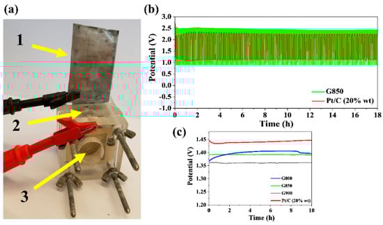 The ORR results of N-doped graphene-based catalysts indicate that these materials could be used as electrocatalysts in Zn-air batteries. For this purpose, the G800, G850, G900 samples were applied as cathodic catalysts as part of an air electrode, and were assembled into home-made rechargeable Zn-air batteries. The assembled batteries were typical two-electrode batteries with a zinc plate applied as anode. Figure 5a presents an example home-made battery setup for testing charge/discharge performance of the assembled Zn-air batteries. As has already been mentioned, a 6 M KOH solution with 0.2 M ZnCl2 was the electrolyte used in charge/discharge experiments. All Zn-air batteries using the G800, G850, and G900 catalysts were compared with similarly prepared Zn-air batteries with the Pt/C (20 wt.% Pt) catalyst used as the cathodic. After 250 cycles (each cycle consisted of two steps: 300 s of charge and 300 s of discharge), the results proved a very high battery stability regarding the charge/discharge potential range, as well as the potential of a fully charged battery. Similar behavior was noted for graphene-based catalysts and the Pt/C catalyst (Figure 5). However, the batteries that had graphene-based catalysts in a gas diffusion electrode offered a broader charge-discharge potential range, and a higher potential of a fully charged battery. These tests assumed that the N-functional groups in graphene-based catalysts are responsible for the promising catalytic performance resulting from ORR activity (cathode). The range of charge/discharge potential difference for batteries with N-doped graphene-based catalysts ranked from 2.5 V (charged) to 1 V (discharged). The open circuit potential (OCP) of Zn-air batteries with the G800, G850, G900 samples was stable and held potential for 10 h at 1.40, 1.39, and 1.36 V, respectively. The stability of OCP for N-doped graphene-based catalysts is very similar to the stability of OCP for a Pt/C catalyst (all OCP values close to 1.45 V).
