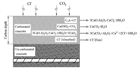 Affected by the concrete’s ability to bind to chloride ion R, under the combined action of CO2 and Cl−, CO2 can cause the following chemical reactions of the combined chloride salts [32]. The interaction between chloride ion and carbon dioxide in concrete is shown in Figure 1. 3CaO∙Al2O3∙CaCl2∙10H2O + 3CO2→3CaCO3 + Al2O3 + Ca2+ + 2Cl− + 10H2O.