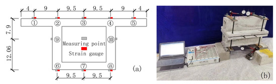 Model box girder measuring points and strain gauge arrangement (unit: cm). (a) Arrangement of measuring points and strain gauges; (b) Loading method.