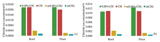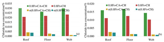 In order to analyze the effect of carbonation on the diffusion of chloride ions, the average chloride ion concentrations in the roof, floor and web under 0.8ft + CA + CH erosion conditions were compared with the average chloride ion concentrations in corresponding positions under 0.8ft + CH erosion conditions. The results are shown in Figure 5.