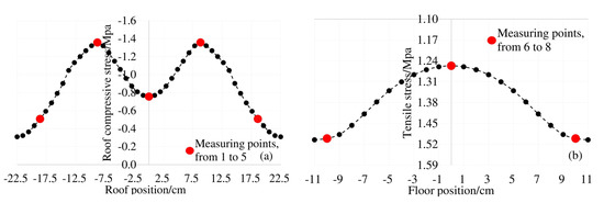 According to China’s national industry standard Code for Design of Concrete Structures [42], the ft of C50 concrete is taken to be 1.89 MPa. A torque wrench is used to tighten the bolts according to the fixed torque to achieve the pulling of the two box beam models. During loading, a dial indicator is used to test the deflection of the top and bottom plates, and the deflection measuring points of the top and bottom plates are arranged at No. 2, No. 4, No. 6 and No. 8 respectively. The strain gauges arranged at the measuring points 6–8 of the bottom plate are mainly used to test the magnitude of the applied tensile stress. Due to the test error, it is difficult to ensure that the strains of the measuring points 6–8 reach 1.5 MPa at the same time. In order to avoid the cracking of the bottom plate due to excessive tensile stress, the loading is stopped immediately when the tensile stress at any of the measurement points (No. 6–8) reaches 1.5 MPa. The compressive strength of the three concrete cube test blocks of standard curing (temperature and humidity are 20 °C ± 2 °C and 95% respectively). after 28 days and the actual vertical deformation and stress test results of each measuring point after loading are shown in Table 5.