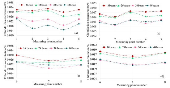 The top plate of the model box girder in this paper is subjected to compressive stress under load. It can be seen from Figure 7a,b, the distribution law of the chloride ion concentration at each measuring point on the top plate at 4 mm and 7 mm away from the surface is consistent with the distribution law of the shear lag effect under the corresponding load conditions in Figure 6a. The Cl− concentration at the top of the box girder under the load is subject to "shear lag distribution". Combined with the structural characteristics of the box girder, there is a two-dimensional diffusion of chloride ions at measuring points 6 and 8 of the bottom plate. The results of shear lag effect distribution in Figure 6b under the same load condition show that the maximum tensile stress also occurs at No. 6 and No. 8 measuring points. The distribution law of the actual chloride concentration in Figure 7c,d is also consistent with the shear lag effect of the box girder floor. Therefore, affected by the spatial structural characteristics of the box girder and the shear lag effect, the Cl− concentration of the box girder is unevenly distributed on the same cross section.