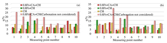 Under the erosion condition of 0.8ft + CA + CH, when the original model does not consider the effect of carbonation, as shown in Figure 8a, the difference rate at 4 mm away from the surface of the box girder is generally more than 10%, and the maximum difference rate is 25.5%. After introducing the carbonation effect coefficient, the improved model in this paper can reduce the difference rate by 4% to 19%. Except for the difference rate of No. 9 measuring point reaching 14.2%, the difference rate of all other measuring points is less than 8%. At 7 mm away from the surface of the box girder, we can see from Figure 8b that the difference rate of the original model is between 4.5% and 29.8%. The improved model in this paper can reduce the difference rate to within 10%, and the maximum drop rate is 18%. The difference rate of the Cl− model considering the effect of carbonation in this paper is generally within 10%, which is more accurate than the original calculation model.