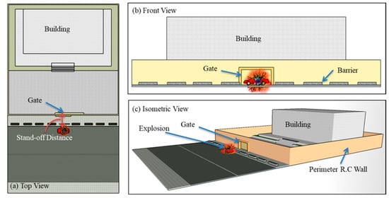The gate is assumed to secure the main entrance of a critical structure, such as an embassy, ministry, or hospital, that needs the highest level of protection, Grade IV (refer to Dusenberry [], buildings levels of protection). In other words, no evacuation is needed, and only superficial damage is expected. The building is surrounded by a reinforced concrete perimeter wall of height 4 m. The gate is supported by that wall and works as the main access to the premises. Figure 1 shows the explosion source, stand-off distance, gate under consideration, reinforced concrete perimeter wall, and building.