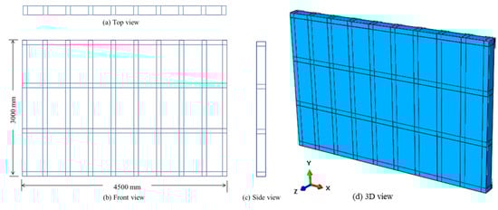 The structure of the gate consists of a steel frame welded to front and back steel plates. The frame consists of 10 vertical and 4 horizontal rectangular steel hollow sections of 180 mm × 100 mm with c/c spacing of 500 and 1000 mm, respectively. The use of more vertical steel hollow sections (with less spacing) is related to the fact that the gate works as a one-way slab supported at the top and bottom edges. Front, top, side and 3D views of the gate are shown in Figure 2. The rectangular hollow sections assumed to have the same thickness as the front and back plates. The gate dimensions are constants while the thickness is variable. Four different values of were considered, which are 2.5, 5, 7.5, and 10 mm, giving four different gates, abbreviated here as, G2.5, G5, G7.5 and G10, respectively.