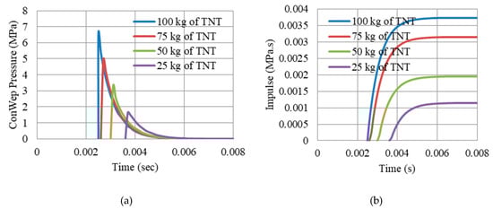 Peak reflected overpressure and impulse history of 4 blast levels (25 kg, 50 kg, 75 kg and 100 kg, R = 5 m), (a) peak reflected overpressure, (b) impulse.