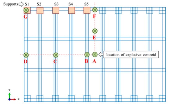 While the stand-off distance R was set as 5 m, the centroid location of the explosive mass may be located anywhere on a plane parallel and 5 m apart from the gate. However, as known, peak reflected overpressure occurs when the angle of incident is 0° (the angle between outward normal of the target and the direct vector from explosive charge toward that point). In other words, points located outside the gate projection have less effect, and are hence excluded. In addition, while the gate (and its supports) is symmetric, possible positions can be taken on quarter of the gate and their effect on nearest supports can then be evaluated. Figure 4 shows 5 highlighted supports S1–S5, and 7 different positions of explosive centroid, denoted as A–G. Results showed that taking different possibilities of explosive positions located on a gate projection with R of 5m had a minor effect on reaction forces (abbreviated hereafter as RFs, or RF for single reaction force) of up to 10%. Hence, the possibilities were omitted and the centre of the gate was selected as the default location.
