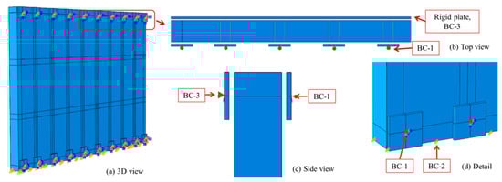Applied boundary conditions (a) 3D view, (b) top view, (c) side view and (d) detail.