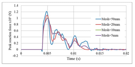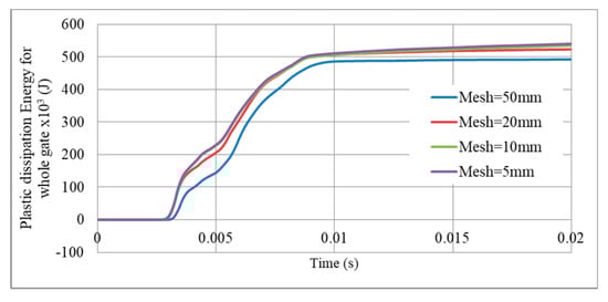 The mesh consists of linear S4R element, which is a 4-node doubly curved shell with reduced integration. As known, computational cost is a key factor in numerical simulations and the “less expensive—more accurate” model should be selected at early stages [,]. Therefore, a detailed analysis of mesh size was conducted to validate the numerical model based on plastic dissipation energy of the gate and peak reaction force at middle supports. Mesh size (or finite element size) of the gate G5, as an example, was varied from 5, 10, 20, and 50 mm. Results revealed that plastic dissipation energy and reaction force for mesh size 5 mm and 10 mm are nearly coincident (<1% error), as shown in Figure 6, Figure 7 and in Table 2. However, results for mesh size 20 mm slightly deviated with more error perceived in the 50 mm option (Table 2). So, the 10 mm mesh size was selected for future simulations of the gate, as it is the less expensive and more accurate model.