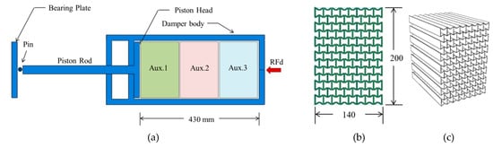 Uniaxial Graded Auxetic Damper (UGAD). (a) Components of the UGAD. (b) Cross-section. (c) 3D.