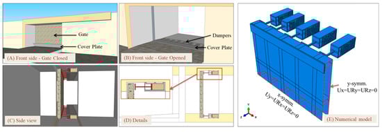 The steel gate, UGADs and virtual supporting concrete structure are shown in Figure 9. It presents where those sacrificial auxetic cores are situated in relation to the whole system. According to Figure 4, the gate requires twenty UGADs uniformly distributed (10 at the top and 10 at the bottom, Figure 9C) to absorb potential blast energy. However, due to symmetry, the numerical modelling of quarter the system would be sufficient (Figure 9E).