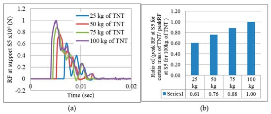 Effect of blast levels (changing mass of TNT) on peak nodal reaction forces, RFs. (a) RF time history. (b) RFm/RF100.