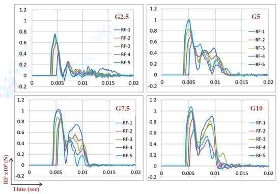 The effect of the mass of the gate on RFs should also be evaluated. The mass of the four gates are shown in Table 4 ranging from 1.1 ton for the G2.5 to 4.38 tons for G10. Results (Figure 11) showed that when mass was increasing, corresponding reaction forces were slightly increasing except the initial sharp rise of 23% in peak RF between G2.5 and G5. For instance, doubling the mass from 2 to 4 tons (gates G5 to G10) led to slight increase in peak RFs of only 7%. Broadly, the selection from G5, G7.5 or G10, would have slight effect on RFs and hence, the same designed UGAD (Section 6) may work for all of them. Moreover, a second peak in the reaction forces can be noticed (Figure 11), which becomes more and more prominent as the gate thickness increases. This can be justified due to the increase in the mass, stiffness, and hence, rebound effect of the gates.