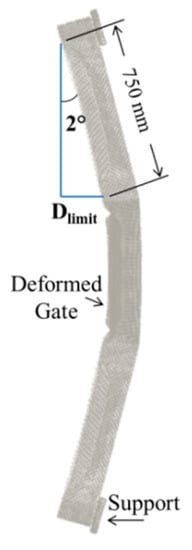 The performance of the 4 gates, G2.5, G5, G7.5, and G10, were assessed based on maximum plastic strain, permanent deformation and corresponding operability. The behaviour was addressed for the peak reflected overpressure 6.6 MPa (from 100 kg of TNT at R = 5 m). As mentioned in Section 2, according to UFC [], an ‘operable’ door after a blast event can be achieved when door edge rotations do not exceed 2°. The primary supporting elements in the gate are the vertical rectangular hollow sections. Their deformation affects operability after a blast event. As shown in Figure 12, a 2° rotation of an unsupported length of 750 mm leads to a deformation limit Dlimit = 750 sin2° = 26.2 mm. If permanent deformation exceeds that limit, then the gate can be considered as inoperable. As an example, Figure 13 shows the catastrophic failure of gate G2.5.