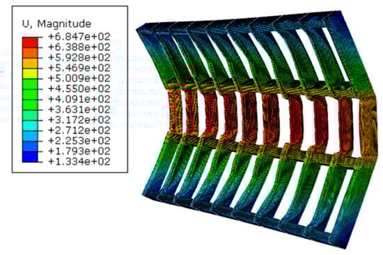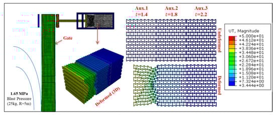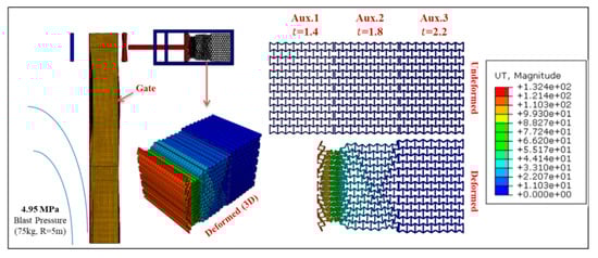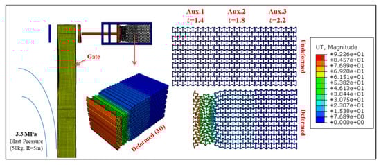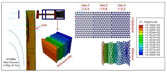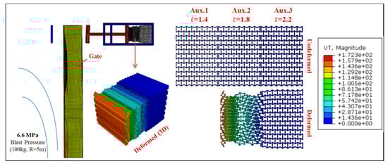 Permanent deformation of Gate G5 and the UGAD (at support S5, Figure 4) are shown in Figure 16, Figure 17, Figure 18 and Figure 19, for different blast pressures. It is explicit that up to 3.3 MPa blast pressure (Figure 16 and Figure 17), the 1st auxetic core (Aux.1) was the only deformed one with maximum deformation of 92 mm. In other words, only Aux.1 has to be changed after such a blast event. Nonetheless, blast pressures between 3.3 and 6.6 MPa (Figure 18 and Figure 19), induces a plastic deformation in both Aux.1 and Aux.2 cores, i.e., both of them should be replaced after such a high blast event. Although Aux.3 (presented in Section 6) was supposed to absorb the 6.6 MPa blast pressure, the first two cores were able to absorb the impact up to their capacity without deforming the third core (Aux.3). This is an extremely important advantage. Hence, Aux.3 hereafter will work as a factor of safety for unexpected higher blast loads or multiple explosions in a short period of time.