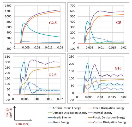 As the aim of this paper is the design of a blast resistant gate supported with passive dampers to absorb more blast energy, it is critical at this stage to understand the energy dissipation of the gate itself. An explosion of 100 kg of TNT releases 461.2 × 106 J of energy at the position of detonation. However, the gate receives much less energy depending on stand-off distance and exposed area of the gate. Figure 15 shows energy components for the four gates, namely G2.5, G5, G7.5, and G10, under a blast of 6.6 MPa (from 100 kg of TNT, R = 5 m, explosive location A). The following points can be highlighted; The more is the mass of the gate, the less the kinetic energy is (e.g., peak kinetic energy for G2.5 is 4 times higher than G10). Plastic dissipation energy and strain energy are the main components of internal energy in the gate. The plastic dissipation energy is found to be decreasing with increasing the thickness . This is linked to the plastic deformations that are normally less for higher values of . The plastic dissipation energy was as high as 1200 × 103 J for G2.5, and as low as 90 × 103 J for G10. In other words, light gates provide better energy absorption at the cost of more permanent deformation. Strain energy found to be increasing with increasing the thickness . Damage dissipation energy was zero as damage criteria were not met. Viscous and creep dissipation energies were also zero. Artificial strain energy was very small (up to 2% of the total internal energy), which reflects the accuracy of the numerical model.