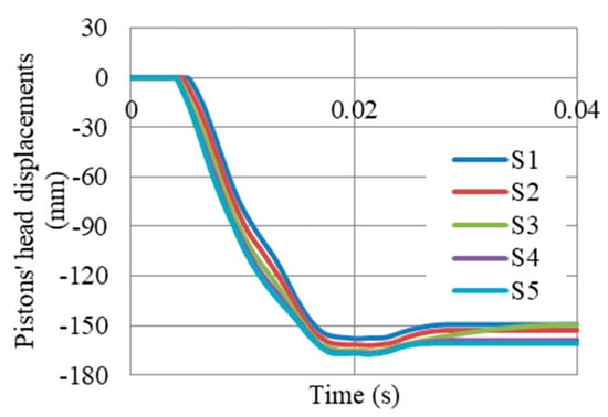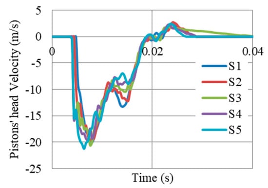 The displacements of pistons’ head (i.e., compressed length of auxetic cores) at supports S1–S5 (Figure 20), shows the integrity of the gate and the movement as one large body. The maximum was 167 mm at S5, while the lowest was 161 at S1. So, the difference was only 6 mm. The results can also be presented in terms of pistons’ head velocity (i.e., velocity of compressing auxetic cores). Figure 21 shows that the velocities of compressing auxetic cores in all UGADs were coincident, with peak velocity of about 20 m/s.