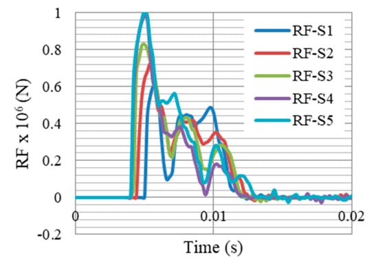 Reaction forces RF at supports S1–S5 without external dampers, after peak reflected overpressure of 6.6 MPa from 100 kg TNT at R = 5 m, Gate G5.