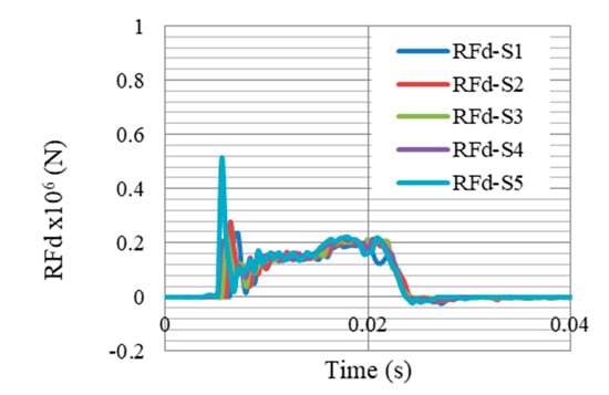 Reaction forces RFd at supports S1–S5 with the auxetic dampers, after peak reflected overpressure of 6.6 MPa from 100 kg TNT at R = 5 m, Gate G5.