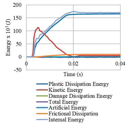 Energy components of the model (shown in Figure 9E), after peak reflected overpressure of 6.6 MPa from 100 kg TNT at R = 5 m, Gate G5.