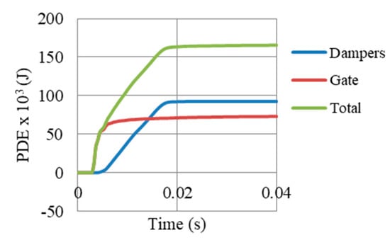 PDE by dampers, gate and the total PDE in the model (shown in Figure 9E), after peak reflected overpressure of 6.6 MPa from 100 kg TNT at R = 5 m, Gate G5.
