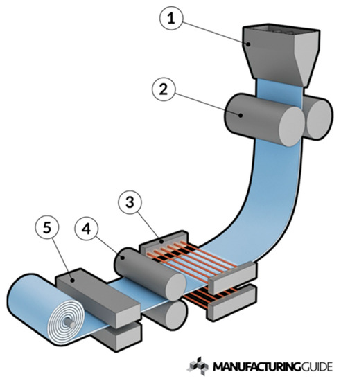 Generic process layout for direct powder rolling. Powder feeder (1), roller (2), sintering furnace (3), additional rolling (4), and cooling (5) (source: https://www.manufacturingguide.com/en/metal-powder-rolling).