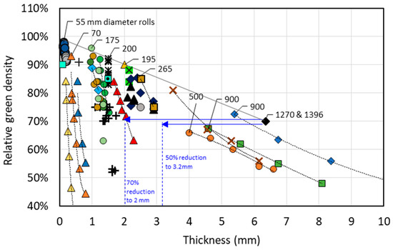 The data in Figure 2 are used to estimate the thickness range of the final product. The thickest green strip in this data set is 6.35 mm with 70% green density, rolled on a 1270 mm roll diameter [14] (the largest diameter in the DPR dataset). After several cold rolling and annealing cycles, the final strip thickness was 2.5 mm at 99.7% relative density. This is a 60% thickness reduction. A 50%–70% reduction was found to be commonly cited in the literature for various green strip thicknesses [5,6,10,11,12,13,14,16]. It is assumed that a green strip thickness of 6.35 mm is the upper limit, given that this was rolled with diameters comparable in size to those of large plate mills used in industry [19]. Assuming that 1270 mm rolls are the limit and that at least a 50%–70% reduction is required to achieve near full density, a reasonable expectation for the maximum thickness range of the final DPR product is 2 to 3.2 mm, as shown in blue in Figure 2.