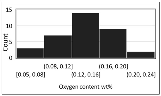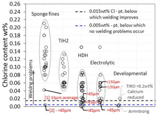 The chlorine content range for various titanium powders reported in the literature and product quotations (41 sources) is consolidated in Figure 3. Sponge fines have the highest chlorine content (0.08–0.21 wt %). There are two points that have unusually low chlorine, which are labeled as point 1 and 2. They also have unusually small particle sizes (average of 33 μm and <45 μm respectively, compared to the typical, as produced size range of 180–850 μm for sponge fines [29]). The action of crushing to a smaller particle size and consequent release of chlorine, as discussed earlier, is a likely explanation for the low chlorine level of point 1 and 2. However, the downside of such small particle sizes is the increased risk of oxygen contamination, as will be discussed later. TiH2 powder has the second highest range of chlorine (0.05–0.12 wt %), followed by the HDH powder range (0.002–0.08 wt % chlorine), which is expected to be lower due to chlorine removal during powder dehydrogenation. The HDH powder could not be separated into that derived from wrought material and sponge, as most sources did not specify the production method. The lowest chlorine content reported for sponge-derived HDH powders is 0.02 wt % [34,35] and 0.023 wt % [36], and chlorine levels below this are assumed to be derived from wrought material, and are therefore not economically feasible. Chlorine l levels as low as 0.02 wt % are also indicated for powders with a PSD (particle size distribution) less than 45 μm. The electrolytic powders investigated in the 1980s show an improvement in chlorine content compared to sponge fines, but levels are above the 0.005 wt % limit identified by Du Pont (dotted blue line), below which no welding problems occur. Furthermore, these powders are no longer commercially available. Of the developmental powders, calcium-reduced hydride powders have relatively low chlorine content (e.g., 0.004 wt %) but were too expensive in the 1980s and did not achieve commercial success [32]. Armstrong powders offer good potential, with chlorine as low as 0.005 wt % or less [37], but these powders are not widely available, and generally have higher oxygen content due to their high specific surface area (a function of their dendritic morphology [38]).