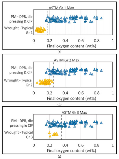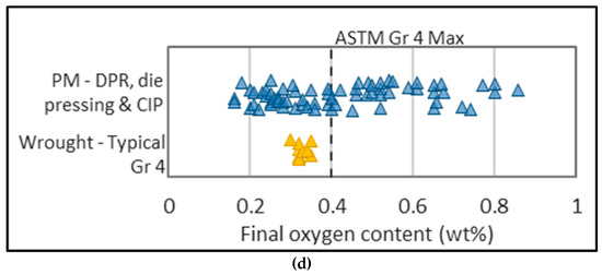 Only three PM data points are within the grade 1 ASTM limit, and none match the typical oxygen content of grade 1 wrought product. The lowest PM oxygen contents match the middle, or more commonly, the tail-end of the typical oxygen range of grade 2 wrought product; however, the ability to meet the typical properties of grade 3 and 4 is better demonstrated (Figure 4c,d).