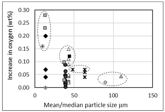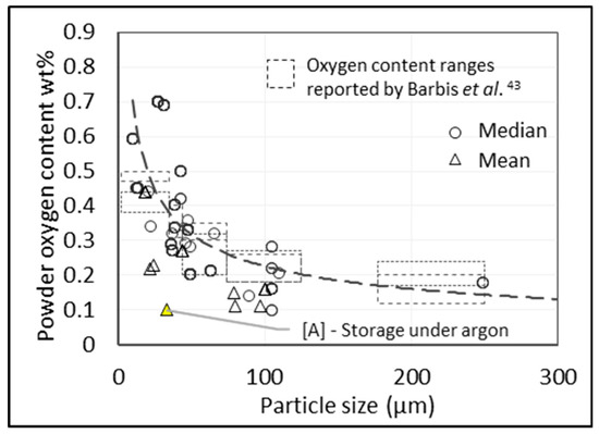 The characteristics of the starting powder impact the initial oxygen content as well as the tendency to pick up oxygen during processing [41]. Consolidated data in Figure 5 show the effect of particle size on oxygen content. Point A [42], an outlier, indicates the level of protection that can be achieved via storage under argon, but whether this can be maintained during the processing of powder to a final product, outside of controlled experimental conditions, is yet to be demonstrated.