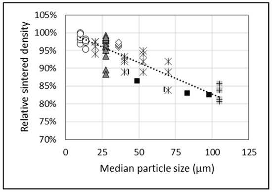 Relative sintered density versus median particle size for cold compacted titanium samples from HDH powder. Sintering temperature ≥ 1000 °C. Compaction pressure ≥ 200 MPa. Data from 6 sources, as indicated by the different symbols.