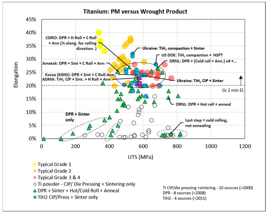 The TiH2 CIP + sinter + hot roll + anneal route (purple) is an alternative route to producing flat product (in this case plate) with similarities in processing to the DPR route (green). The comparison of these two routes in Figure 9 shows that the best performing DPR sample, with an elongation of 26% (ORNL [43]), outperforms the best performing TiH2 CIP sample (ADMA Inc [44]), with 23%. There is a DPR sample with 27% elongation (CSIRO [45]), but this value is only for the rolling direction, and elongation perpendicular to rolling is only 20%. Both the DPR and TiH2 CIP route (purple) meet the minimum ASTM specification for grade 2 although, overall, the performance of DPR is better. It is noted that the TiH2 CIP dataset is small and from a single source: ADMA Inc. Even so, it is an important dataset due to the ADMA Inc recent commercialization of this route.
