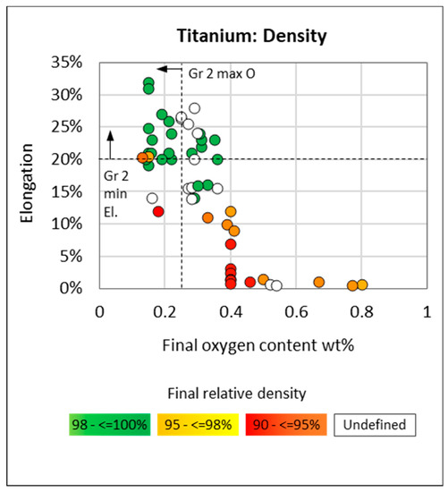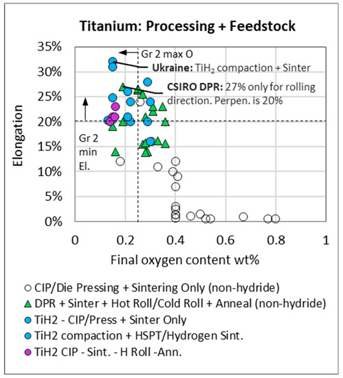 The most notable observation in Figure 9 is that typical elongation for grade 2 product (orange) is commonly 5% above the minimum specification and that most of the best performing PM data points (solid circle) fall within the typical grade 3 and 4 performance area. Further observations from Figure 9 are the following: compaction + sintering of hydride powder (blue) outperforms compaction + sintering of non-hydride powder (white); i.e., for a similar processing route, hydride-derived compacts exhibit the highest elongation compared to non-hydride compacts. DPR samples that were only sintered or did not undergo a final anneal exhibit poor ductility (dashed enclosure in Figure 9). As expected, DPR samples generally exhibit higher elongation than non-hydride CIP/press + sinter only samples due to the additional post-sintering cold and/or hot rolling and annealing, which is likely to close remaining porosity. A further assessment of the data in Figure 10 and Figure 11 confirms this and suggests that lower oxygen content in the DPR dataset may also be a contributing factor. Of the data in Figure 9, those points with accompanying oxygen data are presented in Figure 10. The TiH2 dataset (blue and purple) is the only set to fall within the limits for both the minimum elongation of 20% and maximum oxygen of 0.25 wt %. By overlaying gradated density data in Figure 11, it is evident that high oxygen and poor density are the reason for the poor performance of the non-hydride CIP/Press + sinter route (white symbols in Figure 10). Many of the DPR samples do not meet the grade 2 oxygen limit, but they do meet the grade 2 elongation requirement, which is possibly due to the high relative densities, as observed in Figure 11. The DPR route, by necessity, involves additional processing, and hence the final product has a relative density of over 99% [4,6,9,10,13,14]. The titanium hydride-derived compacts meet both the grade 2 oxygen and elongation specification, which is possibly due to a combination of low oxygen content (<0.25 wt %) and high final density (greater than 98%).