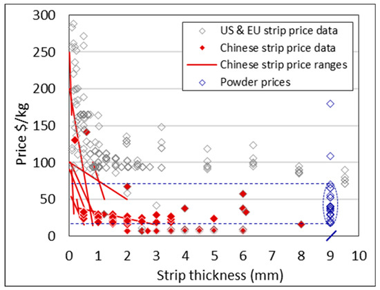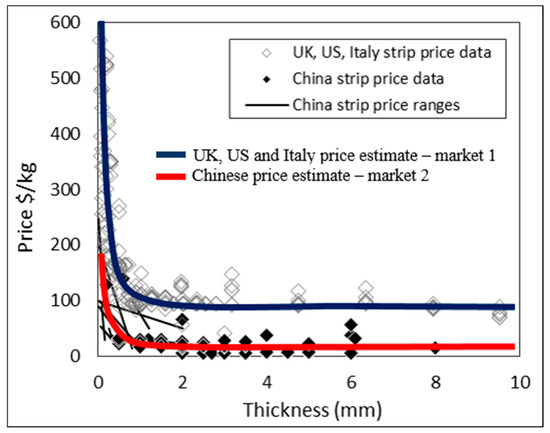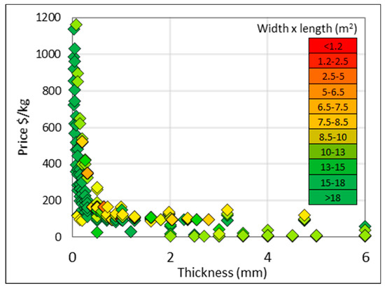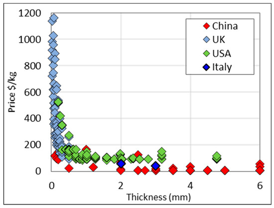 Cold rolling, as the final processing, allows for a better surface finish and dimensional control [46]. However, to produce a thin gauge product such as foil, the number of cold rolling and annealing cycles is considerably large [47]. The cost effect of this is seen in Figure 12, where the unit price increases exponentially due to the additional processing and related costs of rolling the product into thin gauge sheets.