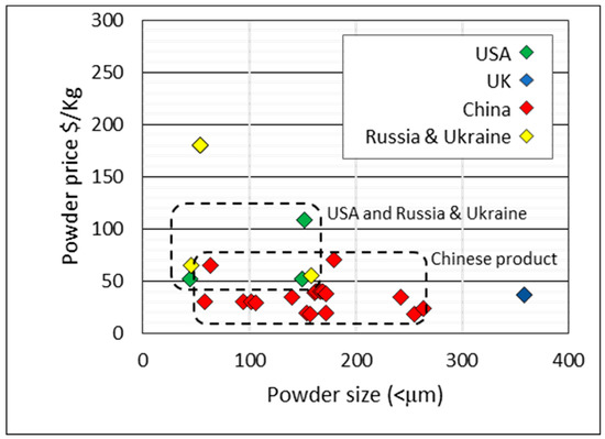 Powder quotations were sourced from manufacturers and distributors in China, the UK, USA, Russia, and the Ukraine. Most of the data are for HDH powder. A minority is for sponge fines. The price data, in Figure 15, are given as a function of powder size (“<μm” indicates that the particle size distribution (PSD) is below this value). The country of origin is indicated by color. Powder from China is the largest sample and is generally cheaper (<$50/kg) than powder sourced from US, UK, and Russian suppliers. In 2012, Qian et al. [56] reported on China’s growing HDH powder industry, possibly off the back of the expanding sponge industry, with HDH powder priced at approximately $15 to $40/kg at the time, which is similar in range to the current prices for the Chinese product observed in Figure 15.
