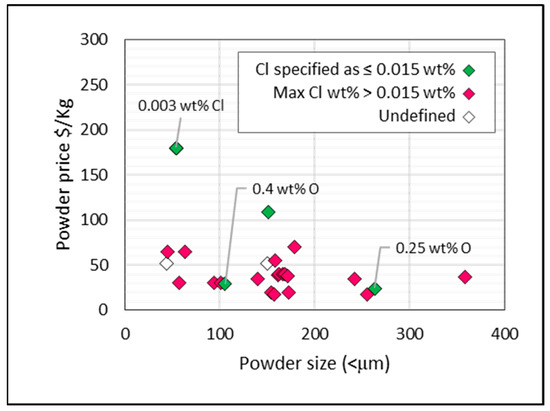 Chlorine is problematic for most of the powders for which prices were sourced. As exhibited in Figure 16, except for four price points (green), it is not guaranteed that the chlorine content is less than 0.015 wt %, the value below which welding is reported to improve. The powder with the lowest chlorine content (0.003 wt %) is the most expensive, at $180/kg. This is in line with German [57], who reported in 2013 that powders with low interstitial levels are priced in the range of $110 to $220/kg. There are only two low-chlorine data points priced below $50/kg, one of which has an unacceptable maximum oxygen content of 0.4 wt %.
