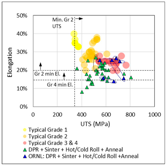 A critical problem for titanium powder metallurgy is titanium’s affinity for oxygen, as it is detrimental to ductility, which is an important performance characteristic for DPR strips given the need to form it into a final product. Given the high specific surface area of powdered material, the formation of oxide layers on individual particles can lead to unacceptable levels of contamination. This significantly affects the mechanical properties of the final product, particularly tensile ductility [39,40]. Oxygen contents for PM (powder metallurgy) product made via DPR, CIP (cold isostatic pressing), and die pressing were consolidated from 25 sources of literature. Up to 90% of the compacts were derived from HDH powders, and the rest were derived from sponge fines. In addition, oxygen contents for wrought product were consolidated from 52 sources of literature. Figure 4 compares the oxygen content of powder-derived product (blue points) to the maximum allowable oxygen content for each of the ASTM grades (dotted line), as well as the typical oxygen content for these grades (yellow points). It is noted that the wider spread in PM data is influenced by experimental testing, while wrought data represent a well-established and finely controlled commercial process.