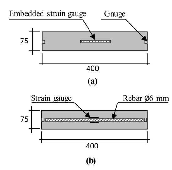 The length change ratio and expansion strain of concrete tests were performed under both free and restrained conditions. For the free condition, the free expansion of concrete was conducted in accordance with the JIS A 1129 [9]. For this test, steel prisms measuring 100 100 400 mm3 and 75 75 400 mm3 were used. The specimens were demolded at 24 h after casting to avoid steel mold confinement. An embedded strain gauge was installed into the center of the unstrained specimens to measure the expansion strain for the free condition (Figure 1a and Figure 2a). For the restrained condition, the concrete was cast into the restrained molds according to the JIS A 6202 [4] (Figure 1b). A strain gauge was attached on the top and bottom surface of the rebar at the center of the specimen. A data logger was used to immediately record the strains of the unrestrained and restrained concrete after casting. Additionally, a restrained method was designed with a size of 75 75 400 mm3 according to the free standard (Figure 2b) to evaluate the effect of different restrained conditions on concrete expansion.