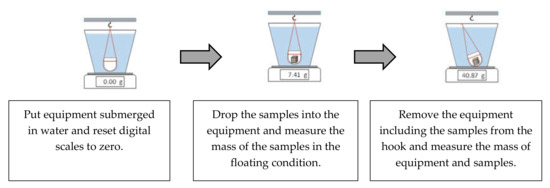 Many studies [2,10,11,12] used the MIP test to determine the total porosity of mortar and concrete. However, the MIP test cannot measure a pore size (diameter) smaller than 3 nm [8,13]. Meanwhile, the gel pore diameter ranges from 1 nm to 10 nm [13]. Therefore, the underwater weighing (Figure 4) test was used herein to determine the satisfactory value of the total porosity of concrete. The preparation of the total-porosity test samples was similar to that for the MIP sample test. After being vacuum freeze-dried for 24 h, the cube samples were immersed in water and continued to be kept in a vacuum chamber for 24 h. The masses of the cube samples were determined under the water in a saturated surface-dry condition and after drying at 105 for 24 h. The total porosity was calculated as follows: