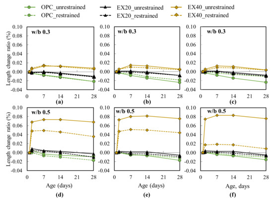 Figure 5 presents the length change ratio of the cement and expansive concrete with different w/b ratios and types of retrained conditions. In the case of w/b 0.3 (Figure 5a–c), an insignificant effect of the restrained condition was observed on the length change ratio of both cement and expansive concrete. Moreover, these results indicate that the length change ratio increased when the expansive additive dosage was increased. These tendencies were found in the test results of w/b 0.5 (Figure 5d–f). However, the effect of the restrained condition on the length change ratio was observed in the case of w/b 0.5, especially for EX40. The length change ratio of the restrained concrete was smaller than that of the unrestrained concrete and was clearly observed when the amount of the expansive additive reached 40 kg/m3. When different restrained conditions were considered (free standard, Figure 5d and e; JIS A 6202, Figure 5f), the expansive concrete sample was tested following the JIS A 6202. It showed the smallest length change, which was caused by the restraint of the steel bars inside it and the two steel plates at both its ends (Figure 1b). Meanwhile, the expansive concrete sample was tested according to the free standard, which was restrained by reinforcement (Figure 2b). The expansive concrete with w/b 0.3 had a smaller length change ratio compared to the expansive concrete with w/b 0.5. This result may be explained by the concrete stiffness. The concrete with w/b 0.5 had a smaller stiffness that led to a higher expansion of the concrete containing the expansive additive. This explanation is consistent with the hypothesis reported by Nguyen et al. [2].